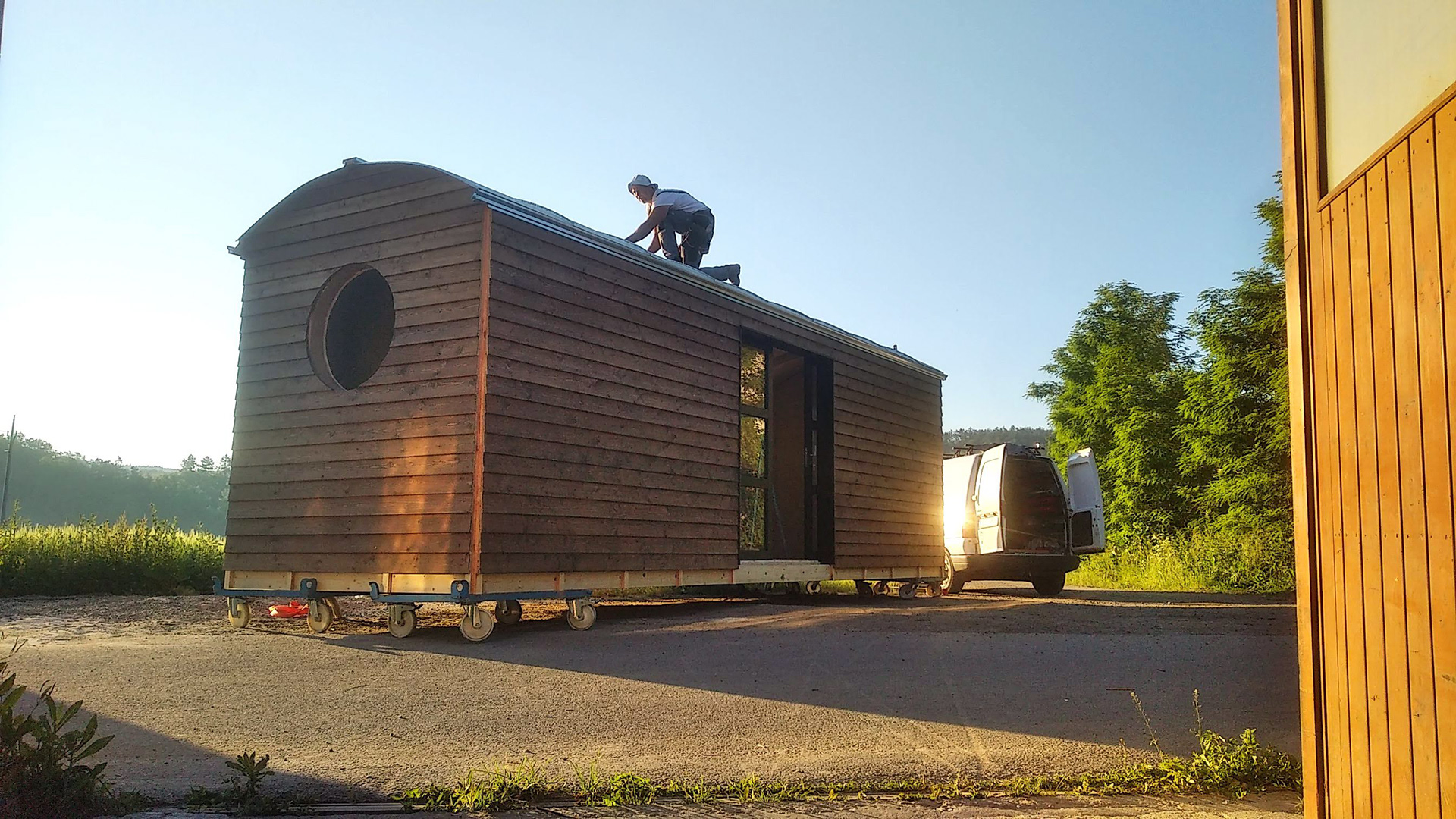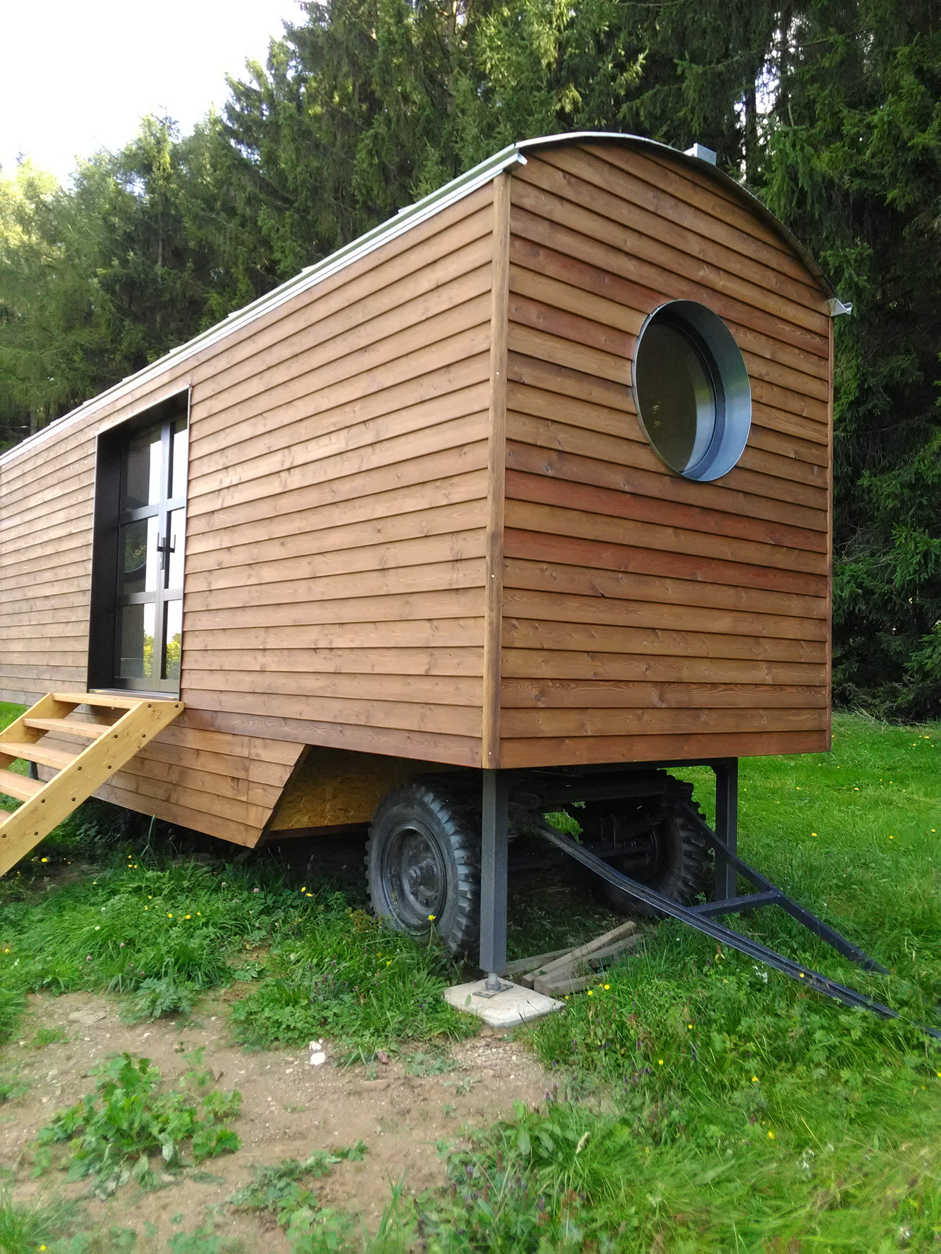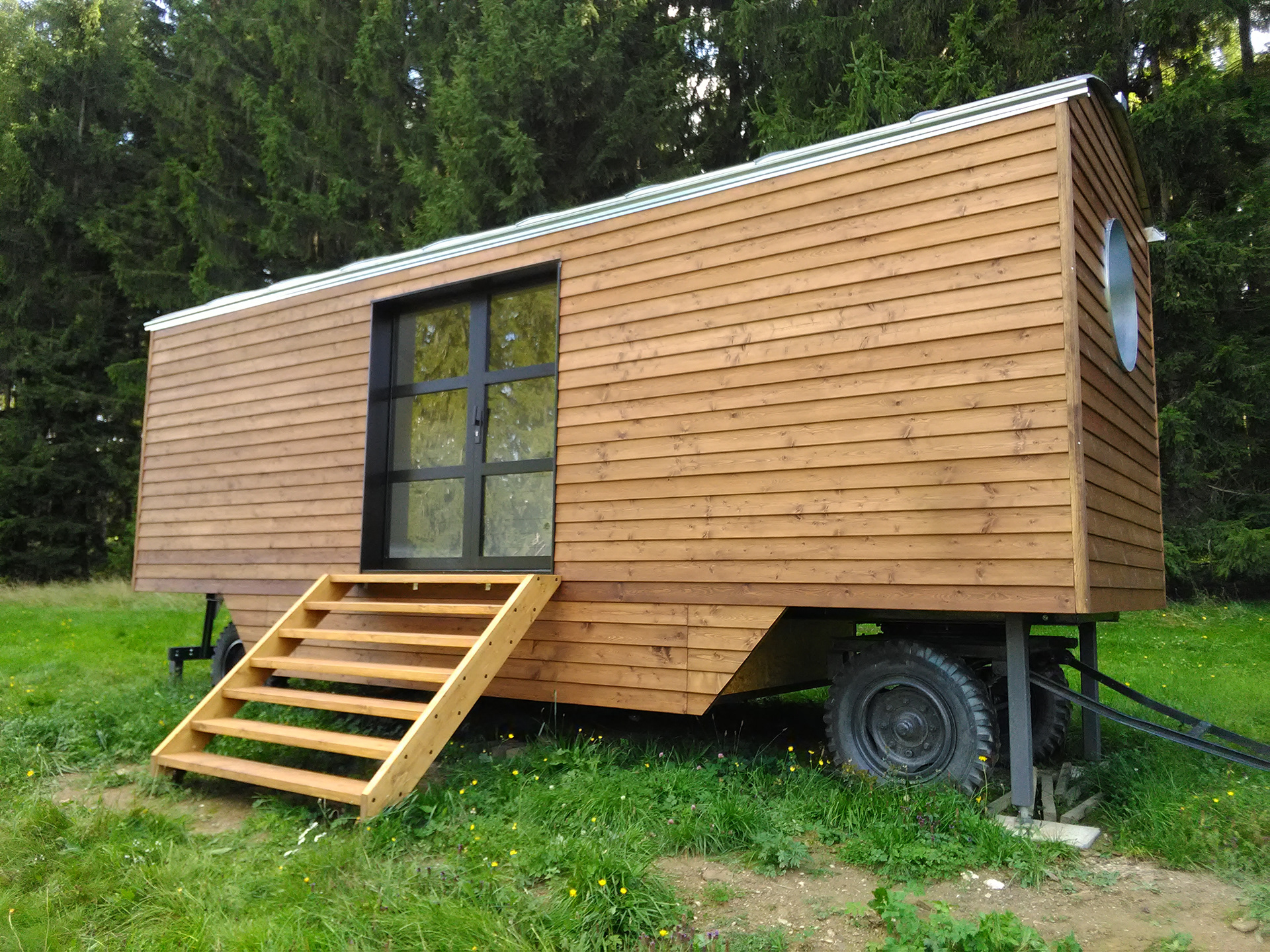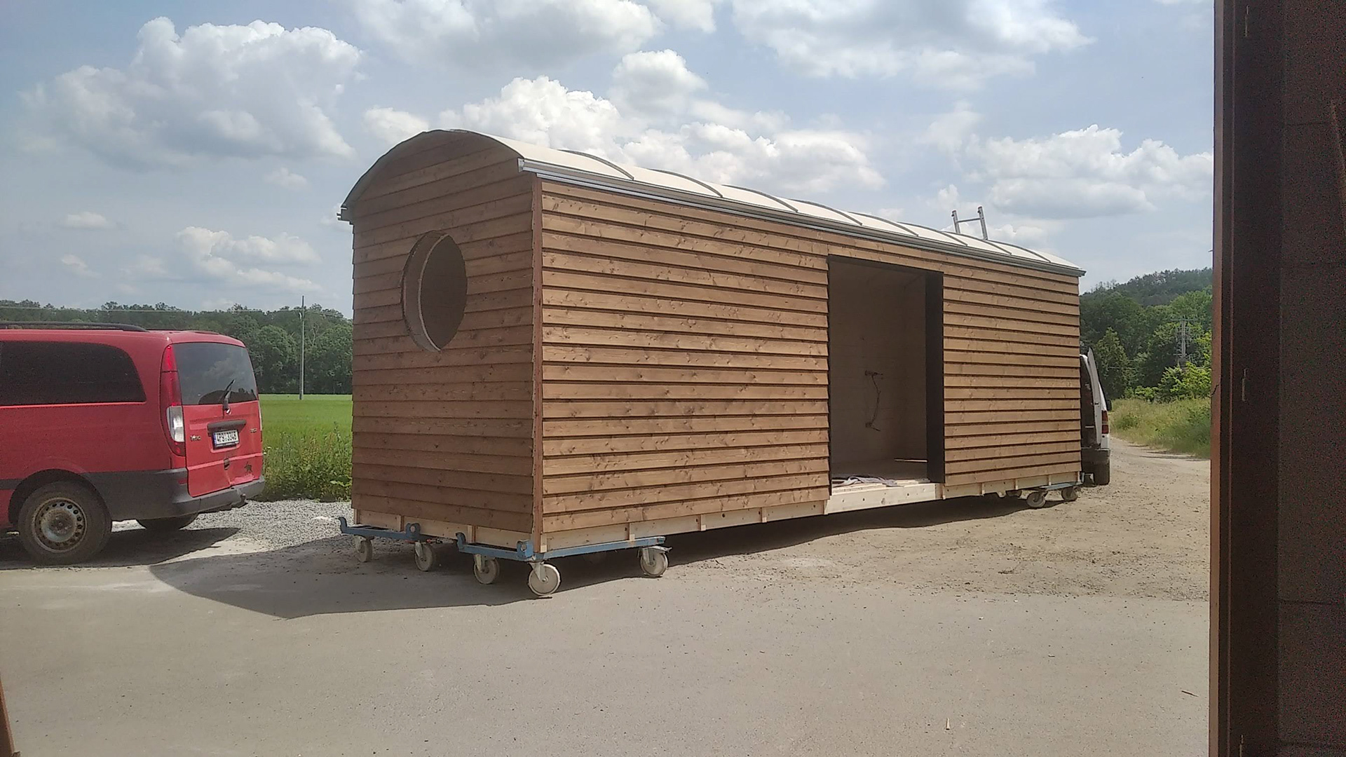 Realizace maringotky. Celodřevěná konstrukce umístěná na původní zrekonstruovaný podvozek. Smrková konstrukce s modřínovým opláštěním. Pohledová oblá konstrukce střechy s přiznanými nosníky.