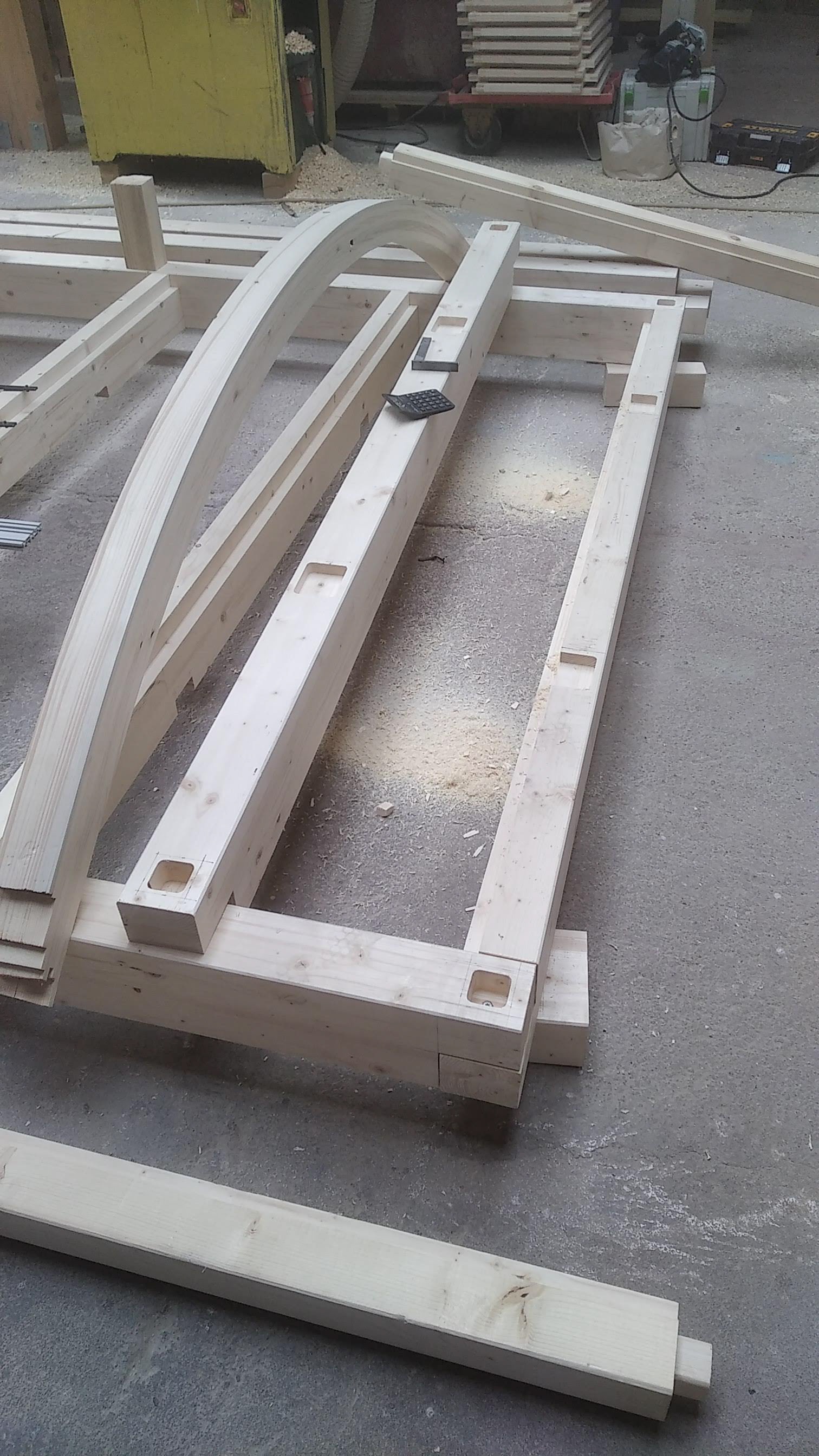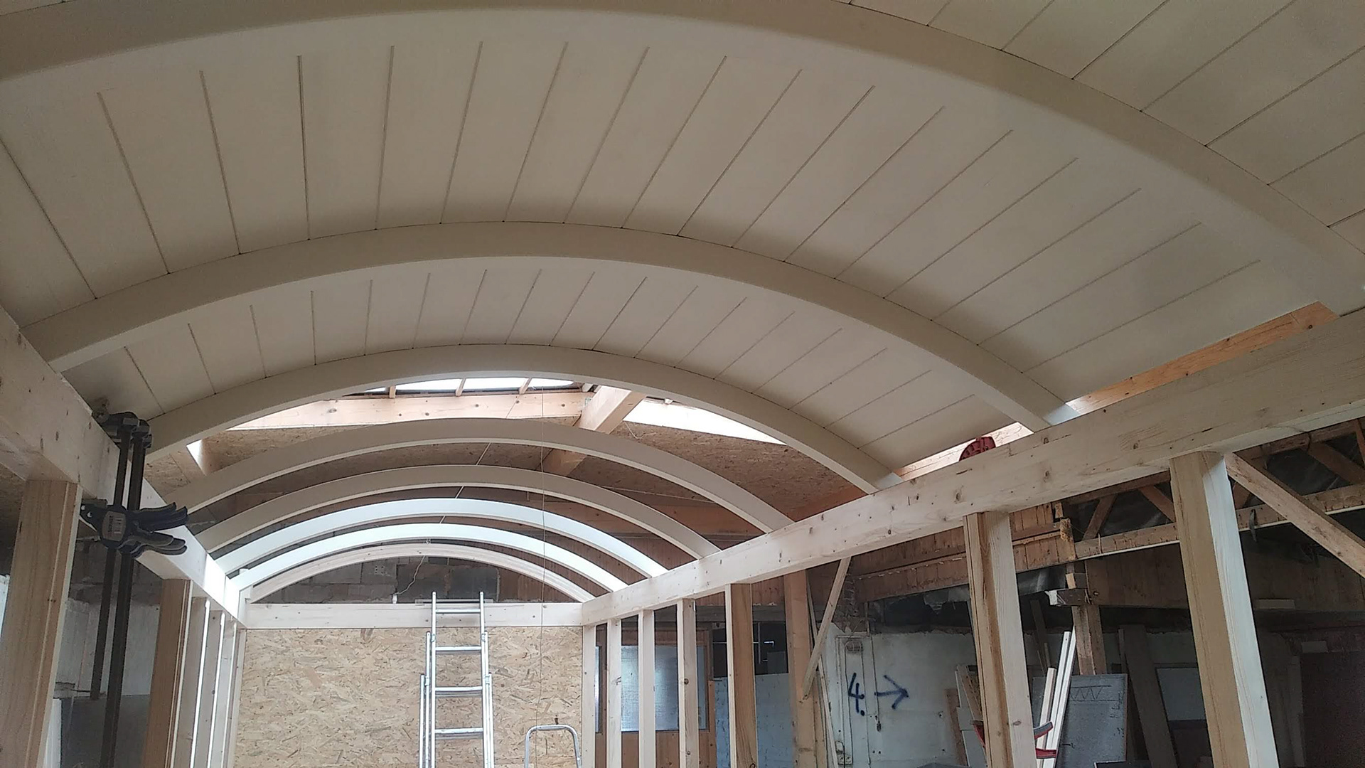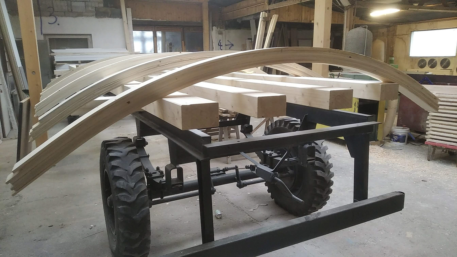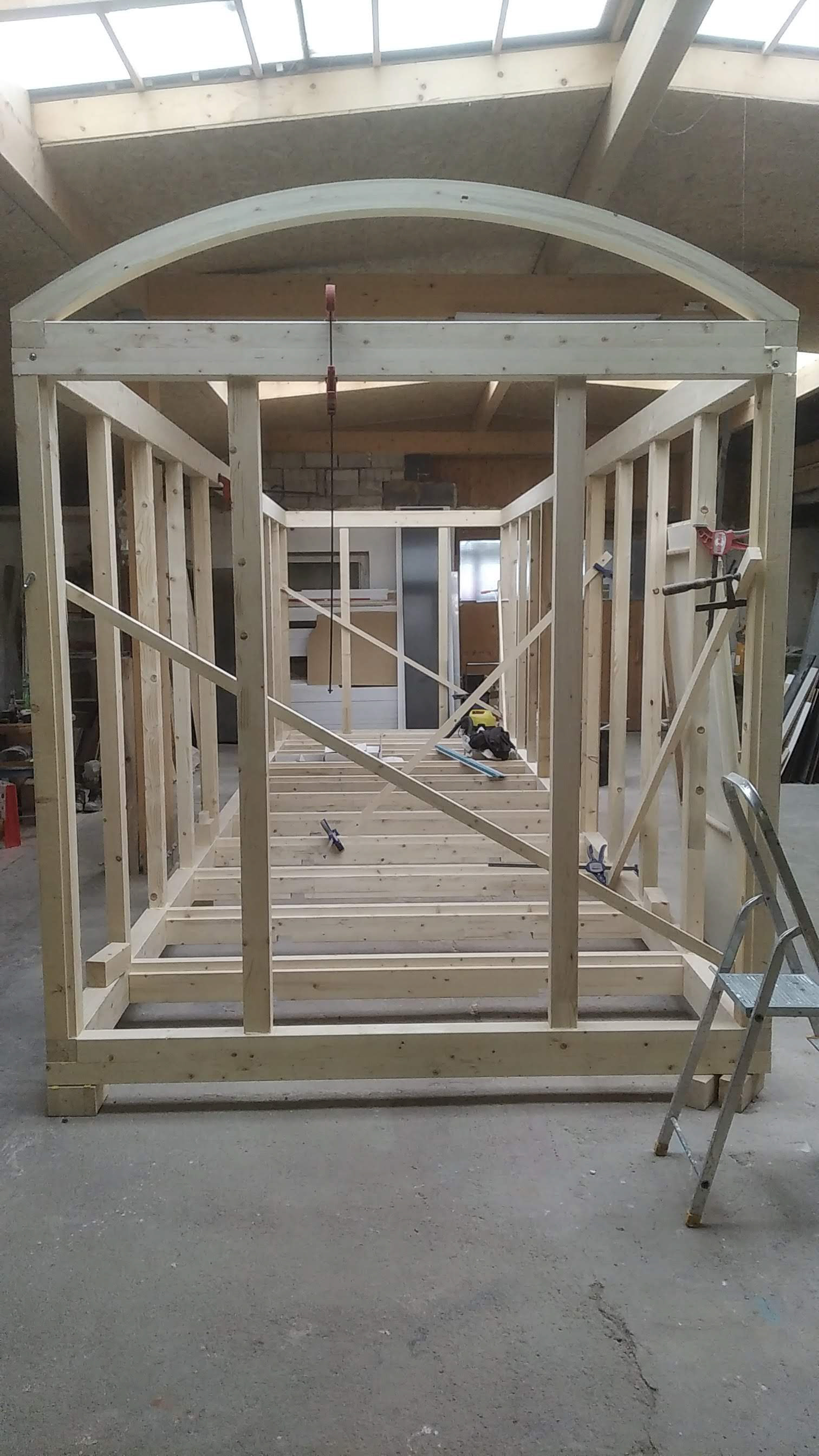 Realizace maringotky. Celodřevěná konstrukce umístěná na původní zrekonstruovaný podvozek. Smrková konstrukce s modřínovým opláštěním. Pohledová oblá konstrukce střechy s přiznanými nosníky.